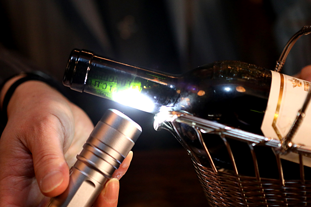 瓶の横からライトを当てて、コルクの状態を確認し、どこまでソムリエナイフを入れるか見極めます。