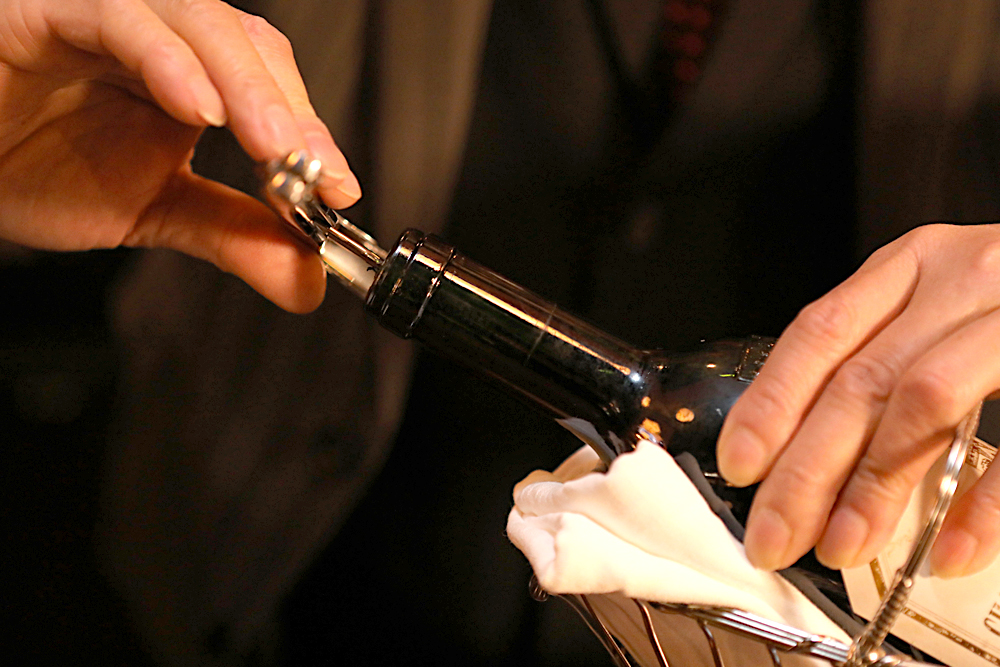 コルク片が入らないよう、慎重にコルクを抜きます。コルクの古さによって抜き方が変わります。